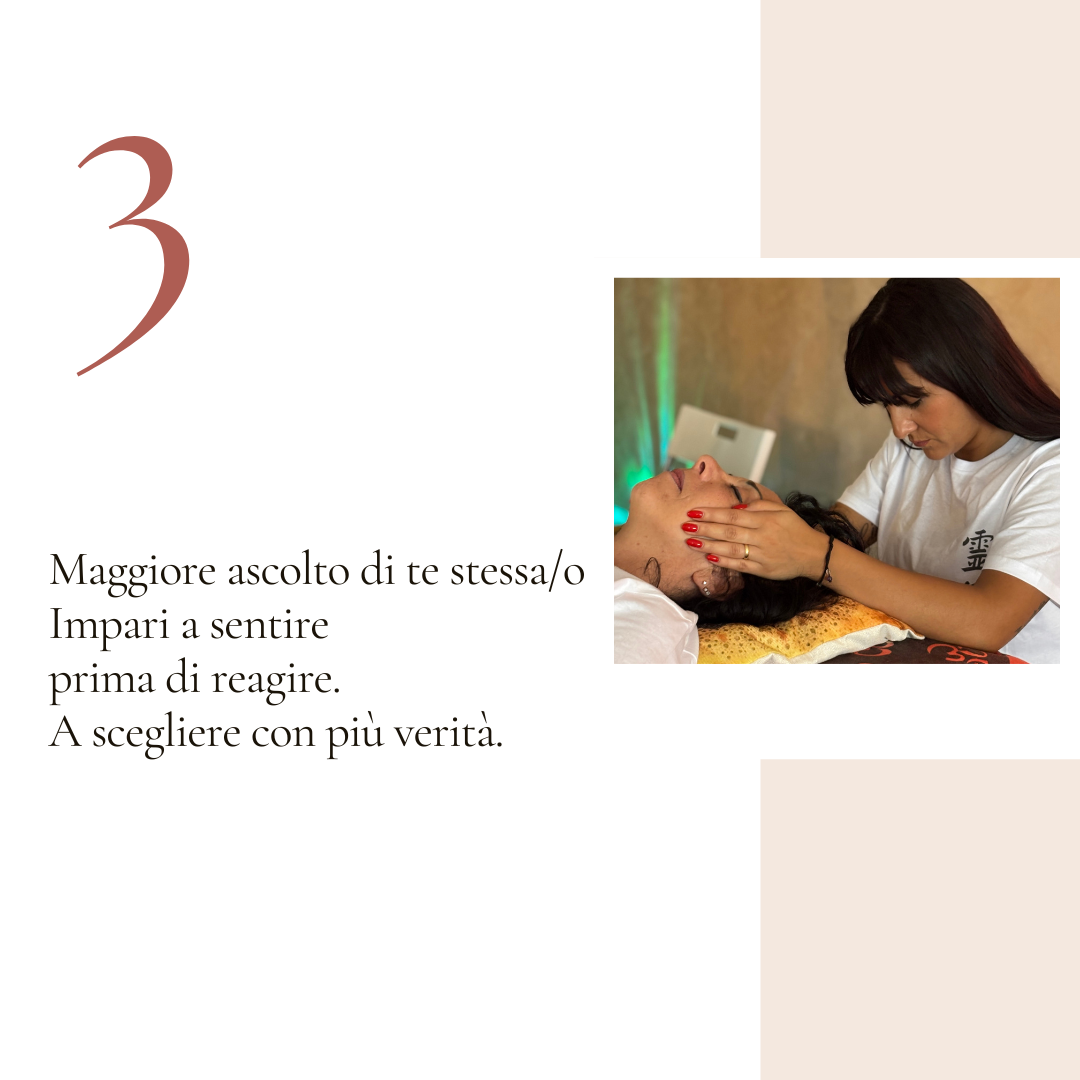 Attraverso la pratica del Reiki, svilupperai un ascolto più sottile del tuo corpo, delle emozioni e delle sensazioni interiori. Questa maggiore sensibilità ti permetterà di riconoscere ciò di cui hai davvero bisogno e di fare scelte più consapevoli.