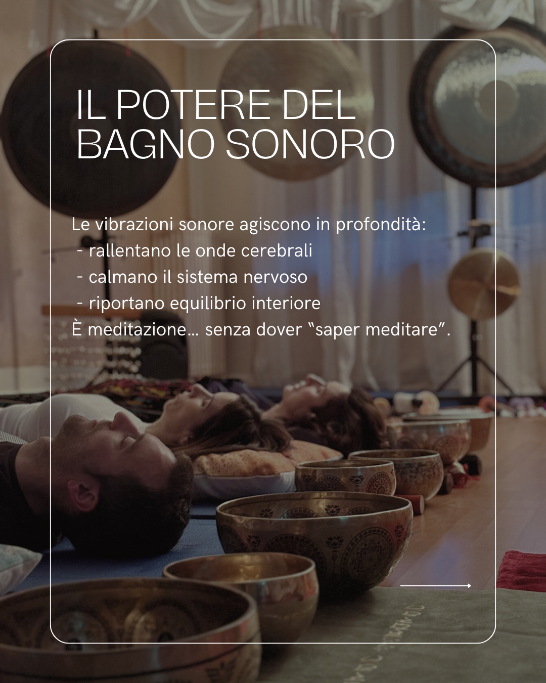 I bagni sonori e le campane tibetane lavorano attraverso la vibrazione. Il suono entra in risonanza con il corpo, favorendo il rilassamento del sistema nervoso e un rallentamento naturale dell’attività mentale.