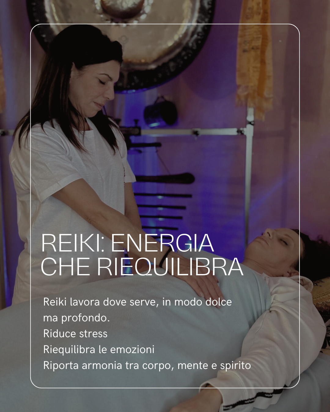 Il Reiki è una pratica energetica che favorisce uno stato di rilassamento profondo e sostiene il naturale processo di autoregolazione del corpo. Attraverso il contatto o la vicinanza delle mani, l’energia viene accompagnata nei punti che ne hanno più bisogno.